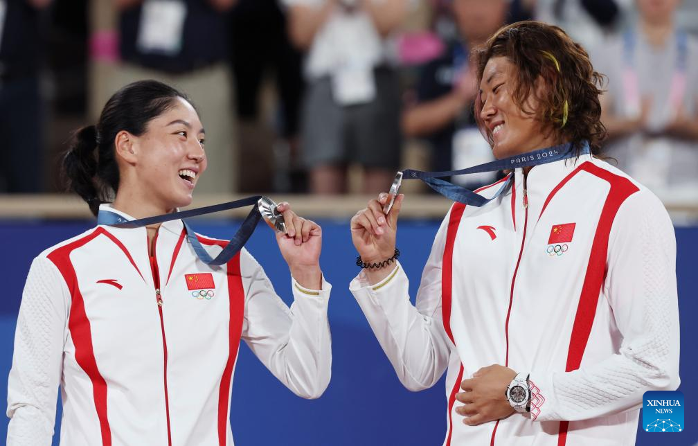 Silver medalists Wang Xinyu/Zhang Zhizhen of China attend the victory ceremony for the mix doubles of tennis at the Paris 2024 Olympic Games in Paris, France, on Aug. 2, 2024. (Xinhua/Gao Jing)