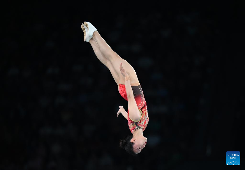 Zhu Xueying of China competes during the women's final of trampoline gymnastics at the Paris 2024 Olympic Games in Paris, France, Aug. 2, 2024. (Xinhua/Cheng Min)