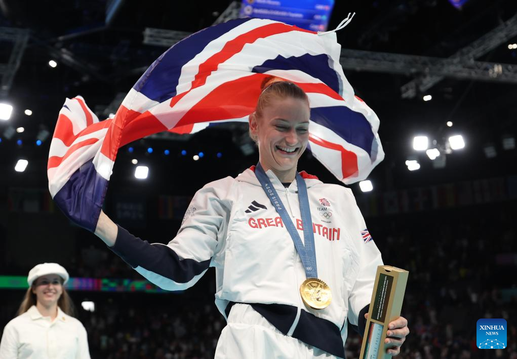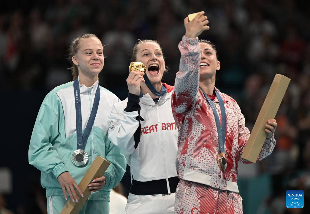 Gold medalist Bryony Page of Great Britain reacts during the awarding ceremony after the women's final of trampoline gymnastics at the Paris 2024 Olympic Games in Paris, France, Aug. 2, 2024. (Xinhua/Cao Can)