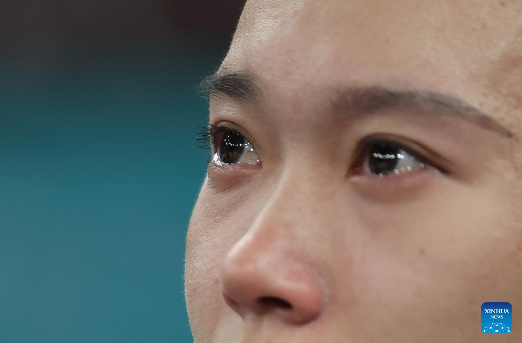 Hu Yicheng of China reacts during the women's final of trampoline gymnastics at the Paris 2024 Olympic Games in Paris, France, Aug. 2, 2024. (Xinhua/Cao Can)