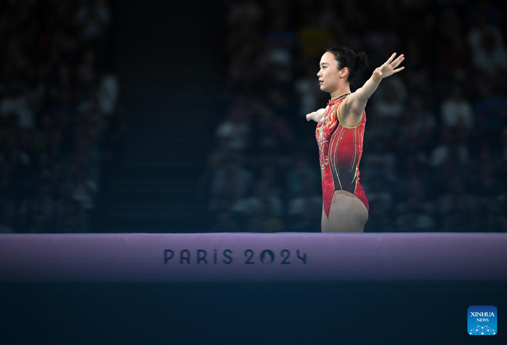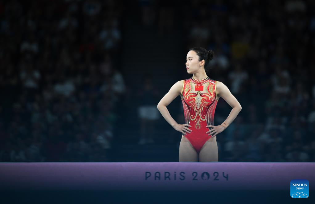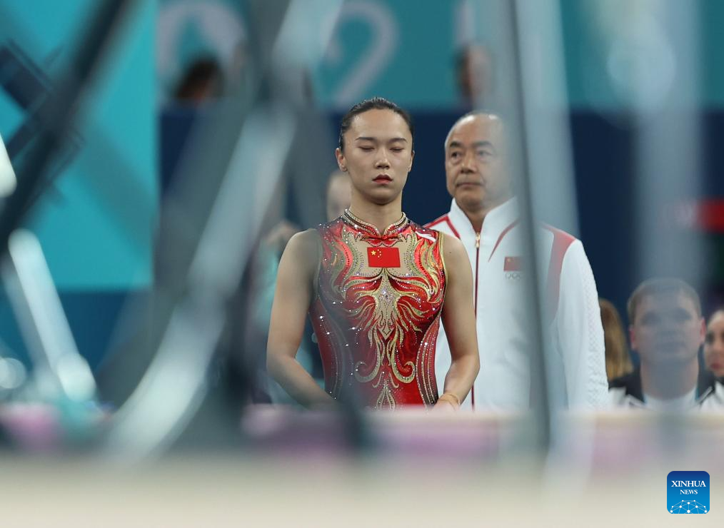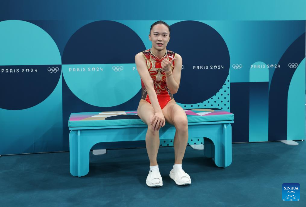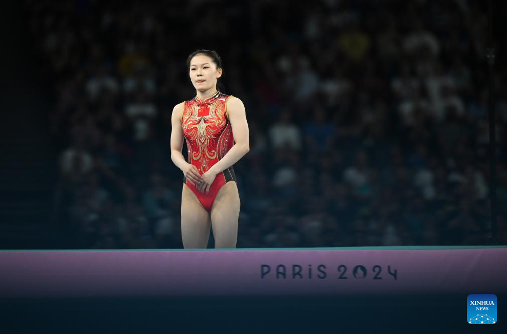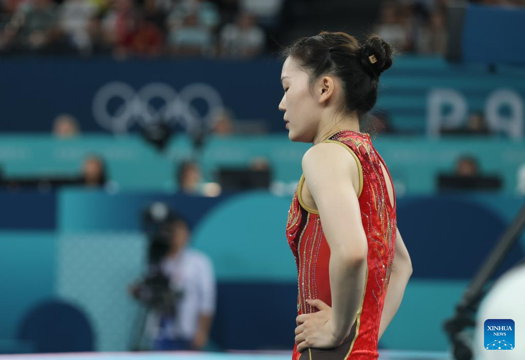 Hu Yicheng of China is seen during the women's final of trampoline gymnastics at the Paris 2024 Olympic Games in Paris, France, Aug. 2, 2024. (Xinhua/Cheng Min)