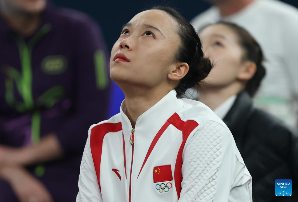 Hu Yicheng (R) of China reacts during the women's final of trampoline gymnastics at the Paris 2024 Olympic Games in Paris, France, Aug. 2, 2024. (Xinhua/Cao Can)