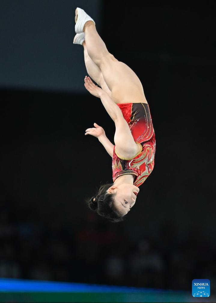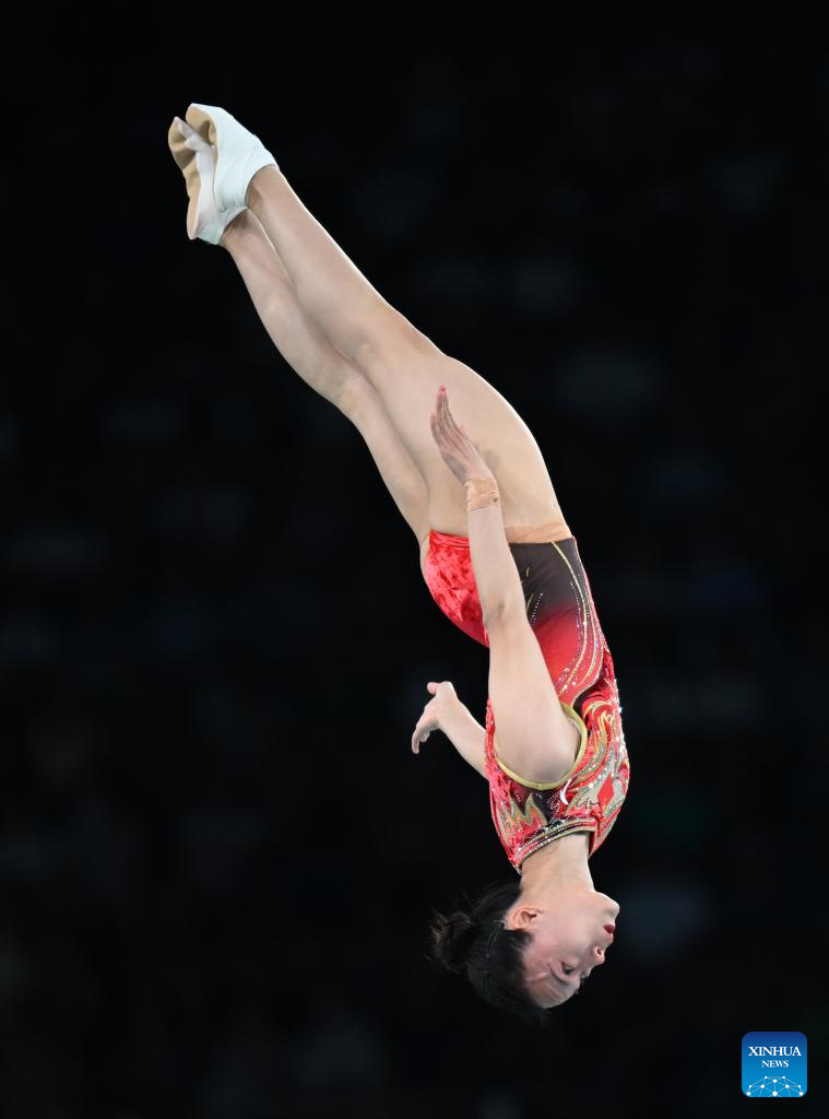 Hu Yicheng of China competes during the women's final of trampoline gymnastics at the Paris 2024 Olympic Games in Paris, France, Aug. 2, 2024. (Xinhua/Cheng Min)