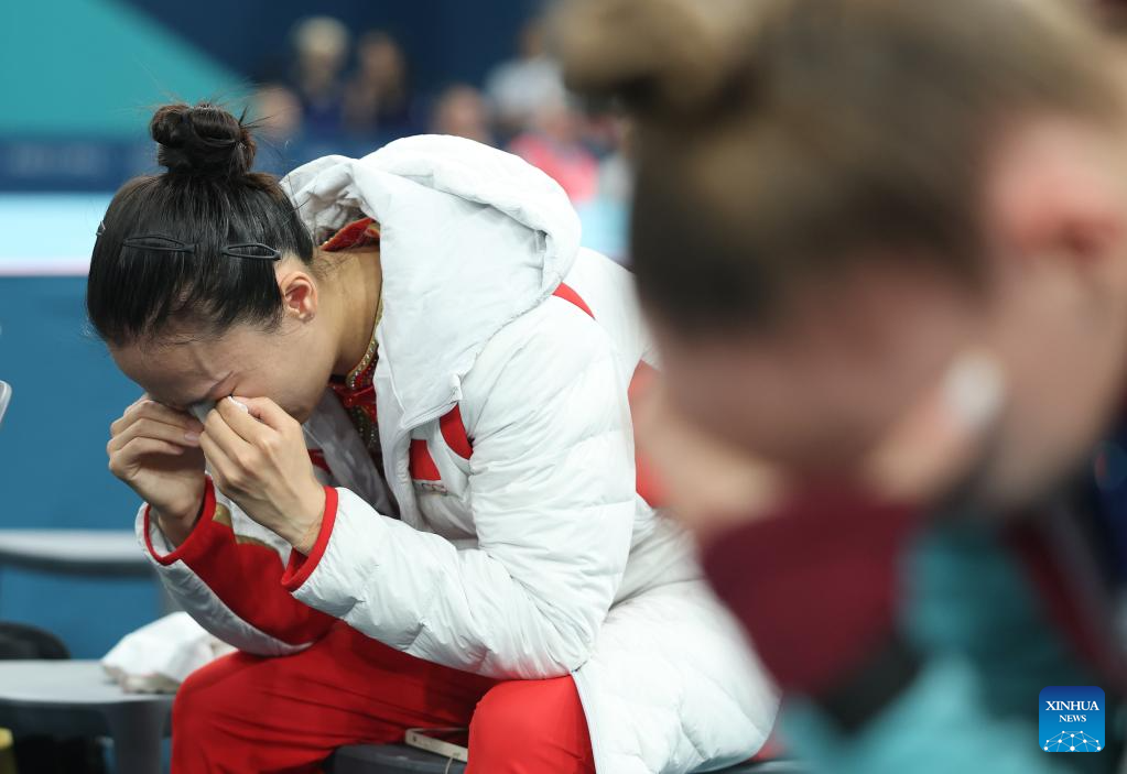 Zhu Xueying of China reacts during the women's final of trampoline gymnastics at the Paris 2024 Olympic Games in Paris, France, Aug. 2, 2024. (Xinhua/Cao Can)