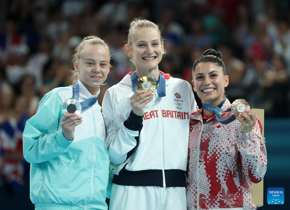 Gold medalist Bryony Page (C) of Great Britain, silver medalist Viyaleta Bardzilouskaya (L) of AIN (Individual Neutral Athlete) and bronze medalist Sophiane Methot of Canada pose for photos during the awarding ceremony after the women's final of trampoline gymnastics at the Paris 2024 Olympic Games in Paris, France, Aug. 2, 2024. (Xinhua/Cao Can)
