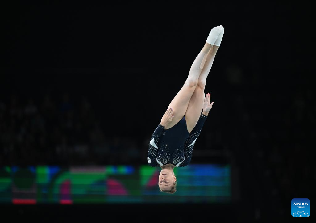 Viyaleta Bardzilouskaya of AIN (Individual Neutral Athlete) competes during the women's final of trampoline gymnastics at the Paris 2024 Olympic Games in Paris, France, Aug. 2, 2024. (Xinhua/Cheng Min)