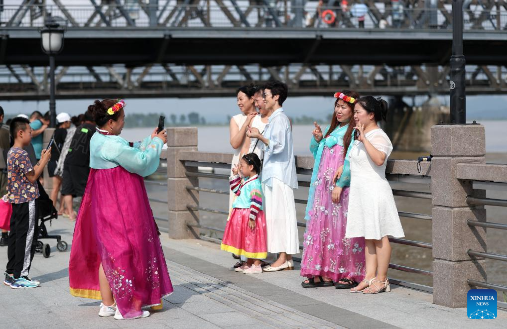 Tourists pose for photos along the Yalu River in Dandong City, northeast China's Liaoning Province, Aug. 2, 2024. Tourism service has resumed as the water level in the Yalu River recedes and the riverside roads are reopened to traffic. (Xinhua/Long Lei)