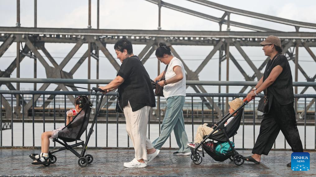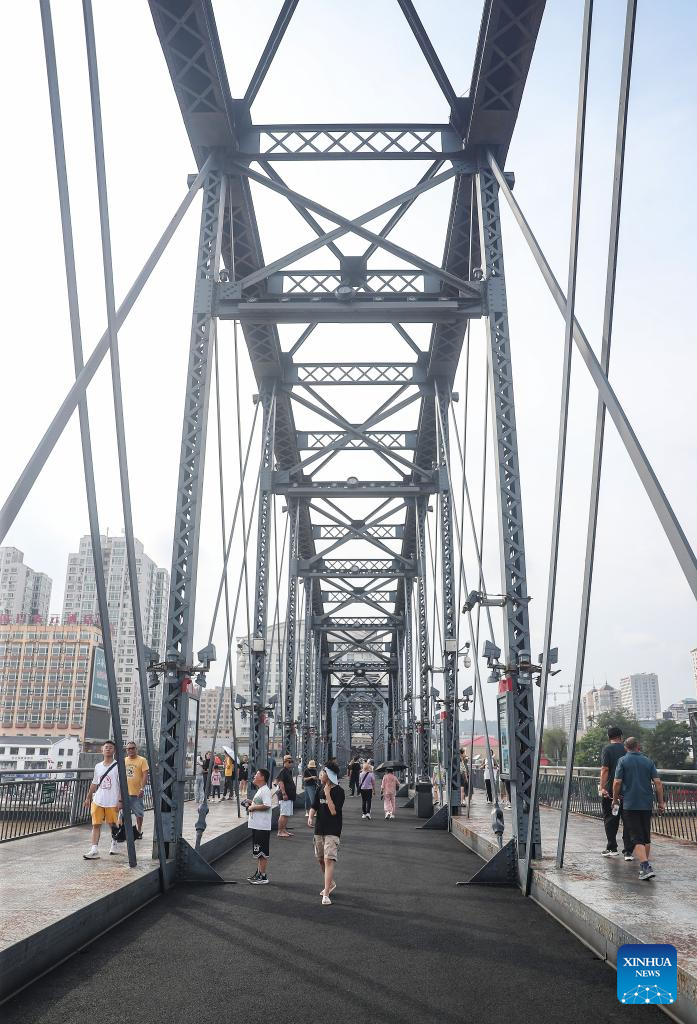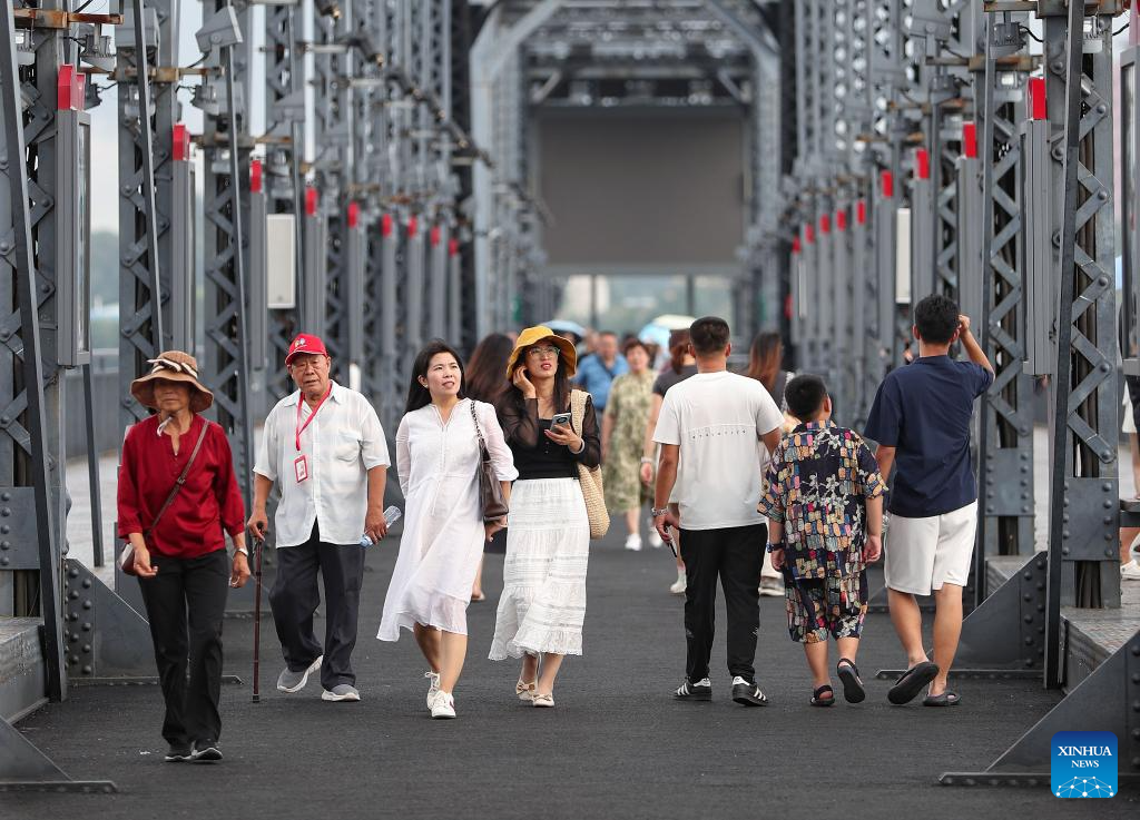 Tourists visit the Broken Bridge over the Yalu River in Dandong City, northeast China's Liaoning Province, Aug. 2, 2024. Tourism service has resumed as the water level in the Yalu River recedes and the riverside roads are reopened to traffic. (Xinhua/Long Lei)