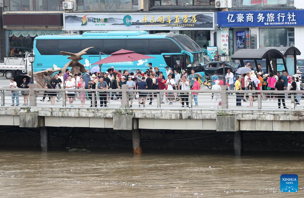 Tourists are pictured by the Yalu River in Dandong City, northeast China's Liaoning Province, Aug. 2, 2024. Tourism service has resumed as the water level in the Yalu River recedes and the riverside roads are reopened to traffic. (Xinhua/Long Lei)