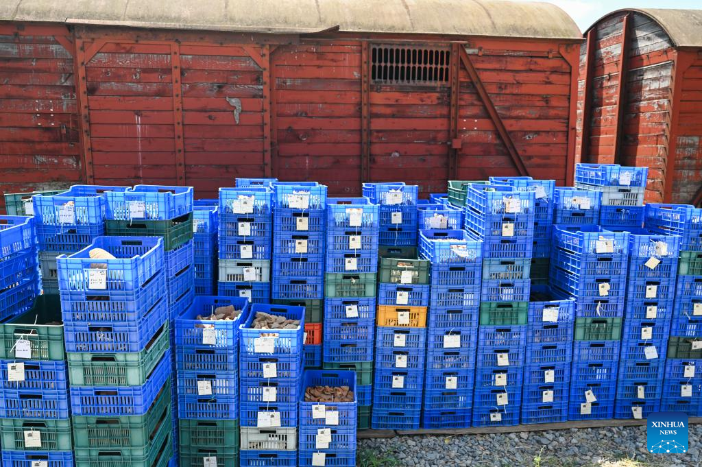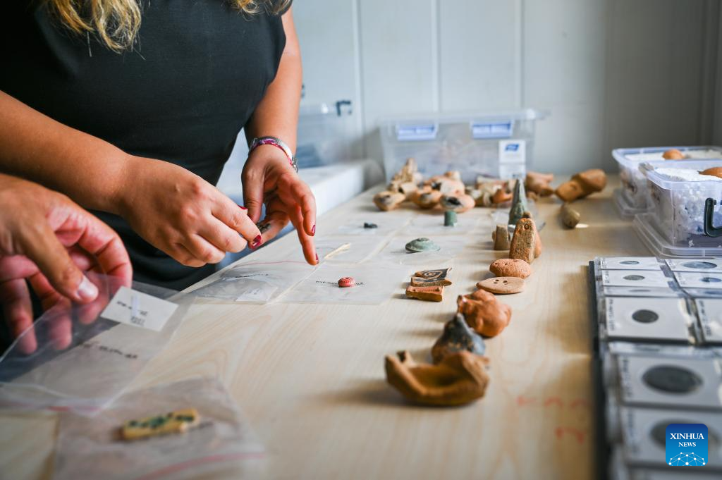 Workers sort out historical relics excavated from a site near the Haydarpasa Train Station in Istanbul, Trkiye, Aug. 1, 2024. Archeologists have unearthed a series of historical remains near the Haydarpasa Train Station, a landmark in Istanbul, since 2018. According to Turkish authorities, they will unveil a 400,000-square-meter archaeology park near the station. (Xinhua/Liu Lei)