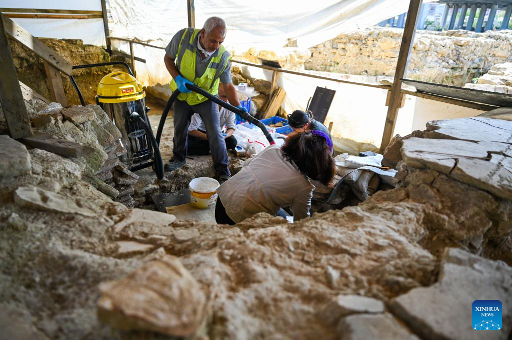 This photo taken on Aug. 1, 2024 shows historical relics excavated from a site near the Haydarpasa Train Station in Istanbul, Trkiye. Archeologists have unearthed a series of historical remains near the Haydarpasa Train Station, a landmark in Istanbul, since 2018. According to Turkish authorities, they will unveil a 400,000-square-meter archaeology park near the station. (Xinhua/Liu Lei)
