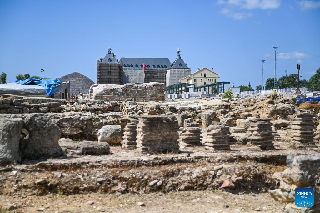 This photo taken on Aug. 1, 2024 shows relic site near the Haydarpasa Train Station in Istanbul, Trkiye. Archeologists have unearthed a series of historical remains near the Haydarpasa Train Station, a landmark in Istanbul, since 2018. According to Turkish authorities, they will unveil a 400,000-square-meter archaeology park near the station. (Xinhua/Liu Lei)
