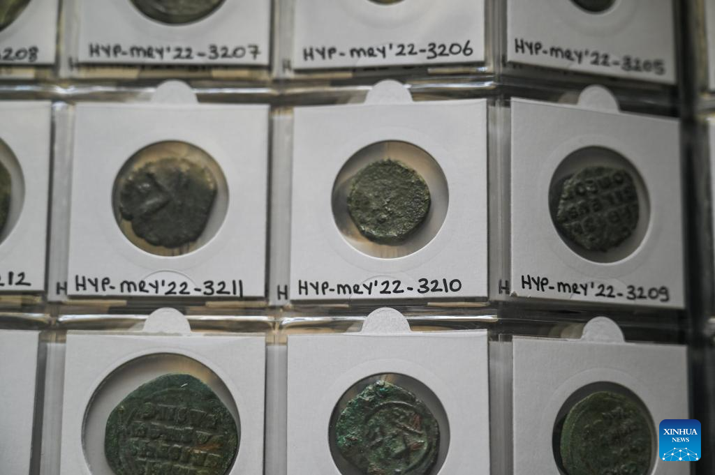 This photo taken on Aug. 1, 2024 shows ancient coins excavated from a site near the Haydarpasa Train Station in Istanbul, Trkiye. Archeologists have unearthed a series of historical remains near the Haydarpasa Train Station, a landmark in Istanbul, since 2018. According to Turkish authorities, they will unveil a 400,000-square-meter archaeology park near the station. (Xinhua/Liu Lei)