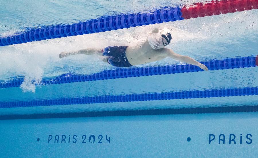 Bobby Finke of the United States competes during the men's 1,500m freestyle final of swimming at the Paris Olympics on Aug. 4, 2024. (Xinhua/Xia Yifang)