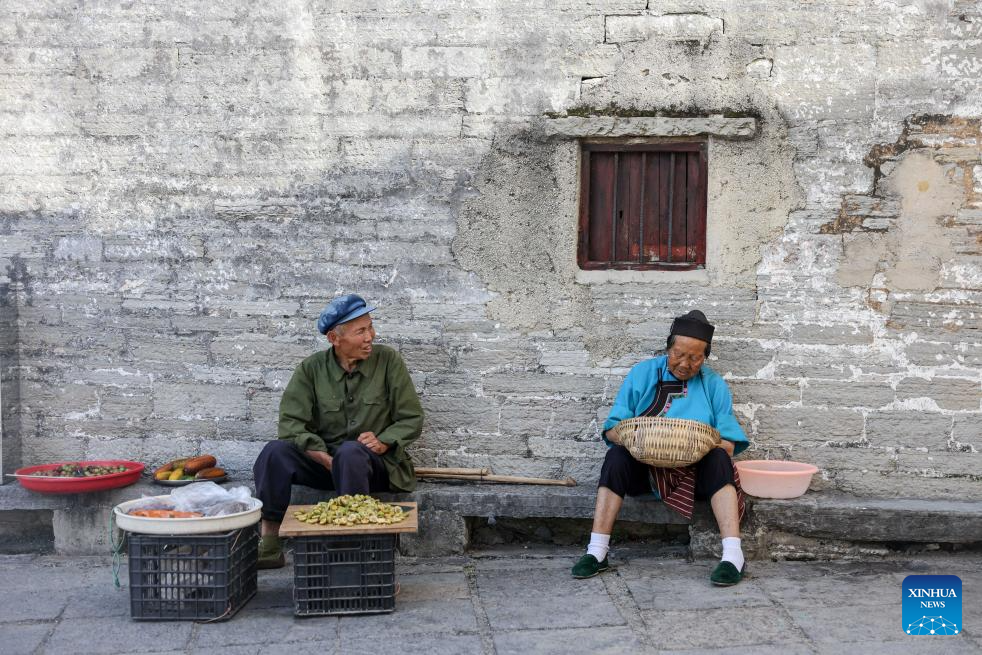 Villagers chat in Benzhai Village, Xixiu District, Anshun City, southwest China's Guizhou Province, July 23, 2024. In Anshun City, southwest China's Guizhou Province, ancient stone buildings and unique local traditions have made a cluster of villages popular tourist destinations for many visitors. The stone-structured Tunpu residential buildings were built in the Ming Dynasty (1368-1644), when some troops were sent to Anshun, where they built villages and turned the neighborhood into farmland for growing crops. Their descendants have lived there over generations, and formed the unique Tunpu culture which preserved distinctive customs, architectures, operas and costumes of ancient times. (Xinhua/Ou Dongqu)
