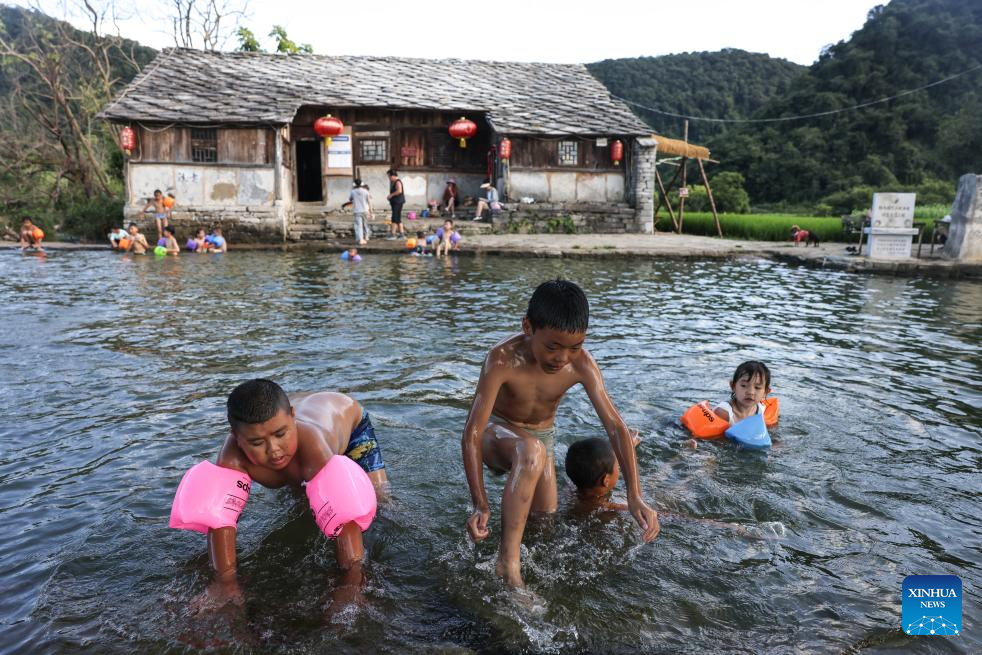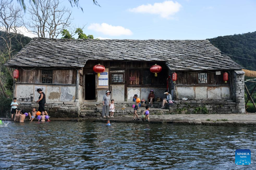 Kids play in the water in Baojiatun Village, Xixiu District, Anshun City, southwest China's Guizhou Province, July 24, 2024. In Anshun City, southwest China's Guizhou Province, ancient stone buildings and unique local traditions have made a cluster of villages popular tourist destinations for many visitors. The stone-structured Tunpu residential buildings were built in the Ming Dynasty (1368-1644), when some troops were sent to Anshun, where they built villages and turned the neighborhood into farmland for growing crops. Their descendants have lived there over generations, and formed the unique Tunpu culture which preserved distinctive customs, architectures, operas and costumes of ancient times. (Xinhua/Ou Dongqu)