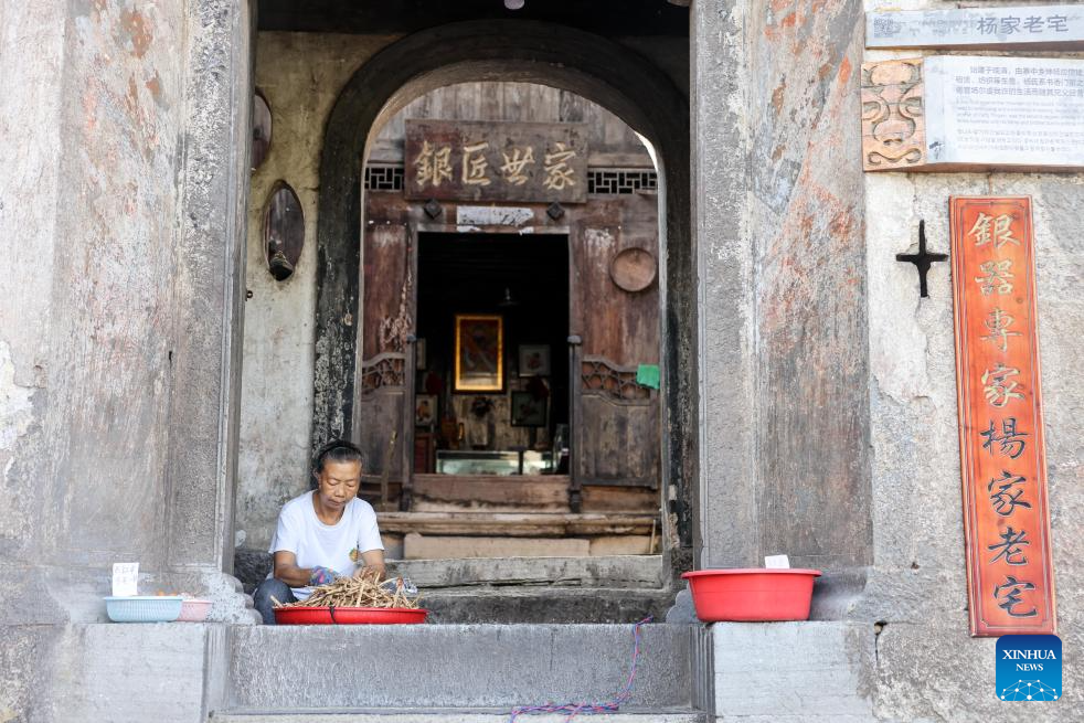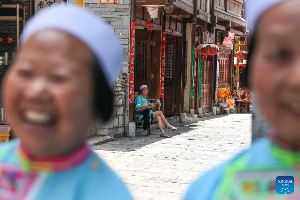 A villager is pictured in Tianlong Tunpu ancient town in Pingba District of Anshun City, southwest China's Guizhou Province, July 25, 2024. In Anshun City, southwest China's Guizhou Province, ancient stone buildings and unique local traditions have made a cluster of villages popular tourist destinations for many visitors. The stone-structured Tunpu residential buildings were built in the Ming Dynasty (1368-1644), when some troops were sent to Anshun, where they built villages and turned the neighborhood into farmland for growing crops. Their descendants have lived there over generations, and formed the unique Tunpu culture which preserved distinctive customs, architectures, operas and costumes of ancient times. (Xinhua/Ou Dongqu)