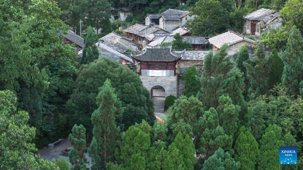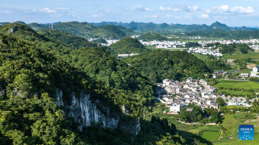 This photo taken on July 24, 2024 shows a view of Baojiatun Village in Xixiu District of Anshun City, southwest China's Guizhou Province. In Anshun City, southwest China's Guizhou Province, ancient stone buildings and unique local traditions have made a cluster of villages popular tourist destinations for many visitors. The stone-structured Tunpu residential buildings were built in the Ming Dynasty (1368-1644), when some troops were sent to Anshun, where they built villages and turned the neighborhood into farmland for growing crops. Their descendants have lived there over generations, and formed the unique Tunpu culture which preserved distinctive customs, architectures, operas and costumes of ancient times. (Xinhua/Ou Dongqu)