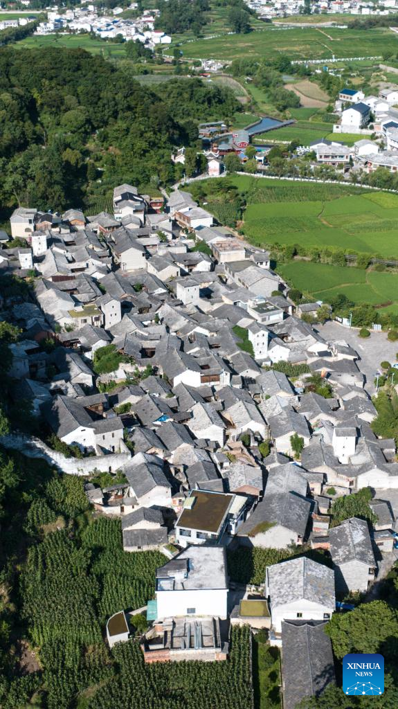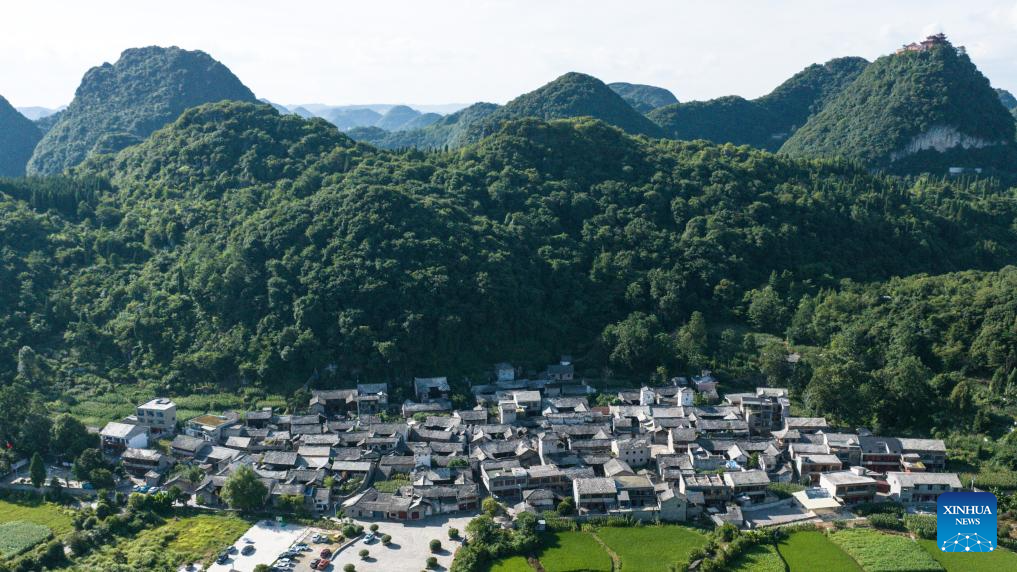 An aerial drone photo taken on July 23, 2024 shows a view of Yunshantun Village in Xixiu District of Anshun City, southwest China's Guizhou Province. In Anshun City, southwest China's Guizhou Province, ancient stone buildings and unique local traditions have made a cluster of villages popular tourist destinations for many visitors. The stone-structured Tunpu residential buildings were built in the Ming Dynasty (1368-1644), when some troops were sent to Anshun, where they built villages and turned the neighborhood into farmland for growing crops. Their descendants have lived there over generations, and formed the unique Tunpu culture which preserved distinctive customs, architectures, operas and costumes of ancient times. (Xinhua/Ou Dongqu)