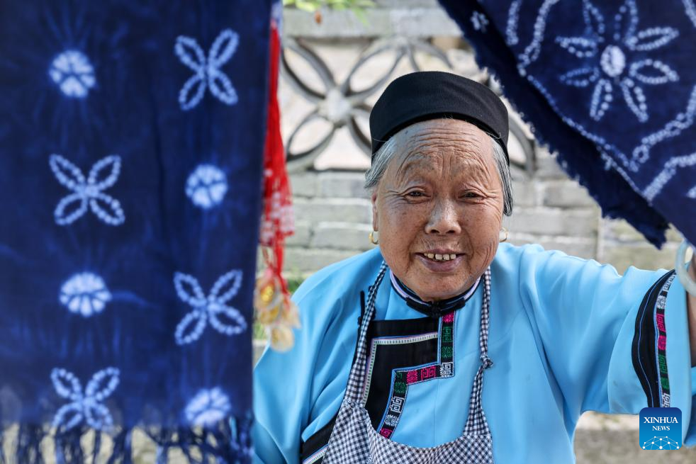 A villager (back) makes shoe soles in Tianlong Tunpu ancient town in Pingba District of Anshun City, southwest China's Guizhou Province, July 25, 2024. In Anshun City, southwest China's Guizhou Province, ancient stone buildings and unique local traditions have made a cluster of villages popular tourist destinations for many visitors. The stone-structured Tunpu residential buildings were built in the Ming Dynasty (1368-1644), when some troops were sent to Anshun, where they built villages and turned the neighborhood into farmland for growing crops. Their descendants have lived there over generations, and formed the unique Tunpu culture which preserved distinctive customs, architectures, operas and costumes of ancient times. (Xinhua/Ou Dongqu)