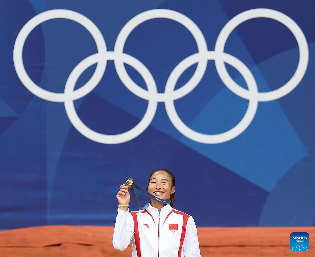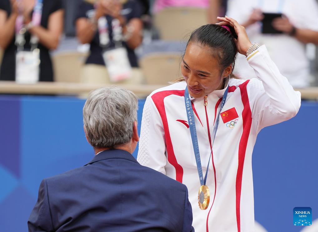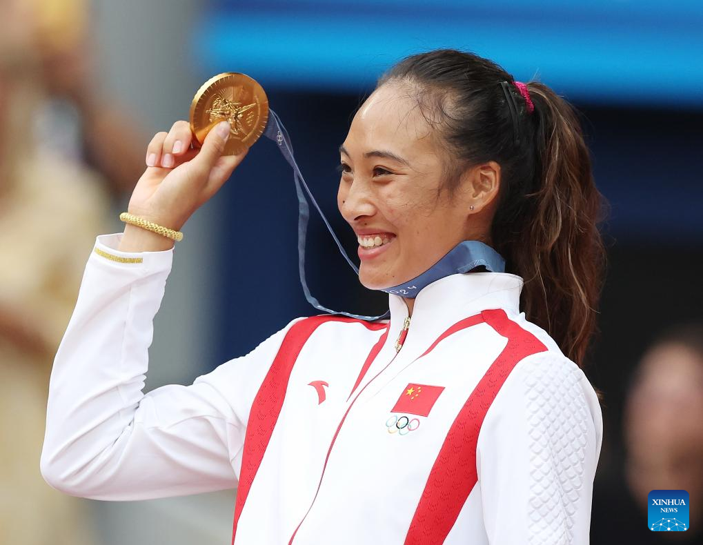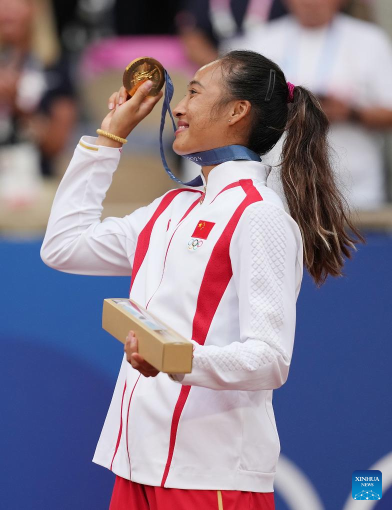 Gold medalist Zheng Qinwen of China shows the medal during the victory ceremony for the women's singles of tennis at the Paris 2024 Olympic Games in Paris, France, on Aug. 3, 2024. (Xinhua/Wan Xiang)