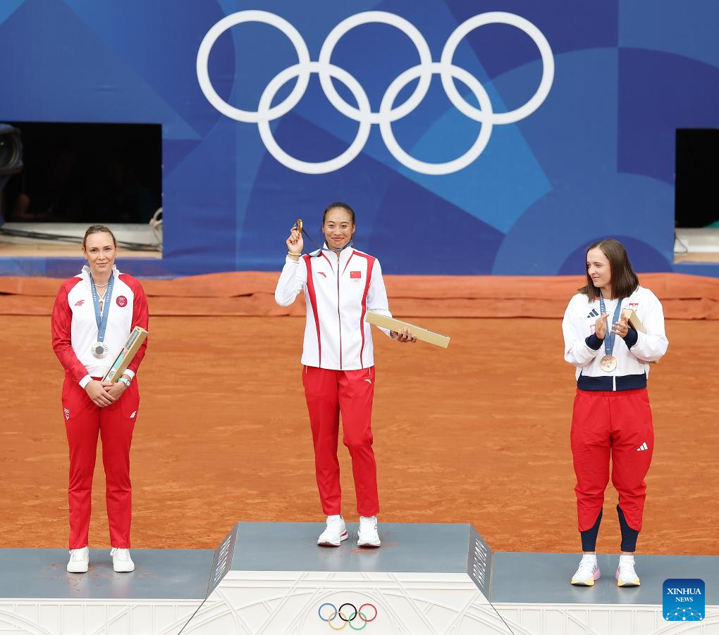 Gold medalist Zheng Qinwen (R) of China attends the victory ceremony for the women's singles of tennis at the Paris 2024 Olympic Games in Paris, France, on Aug. 3, 2024. (Xinhua/Gao Jing)