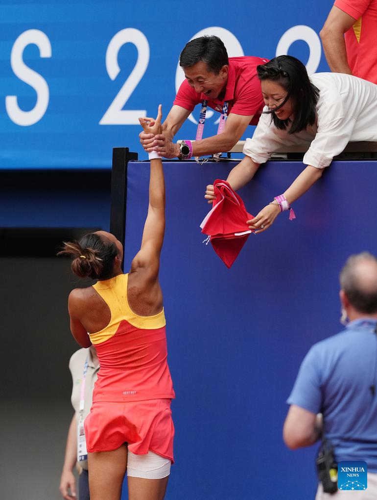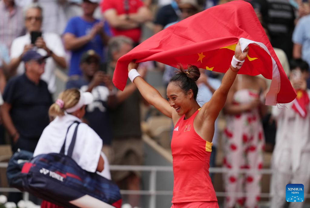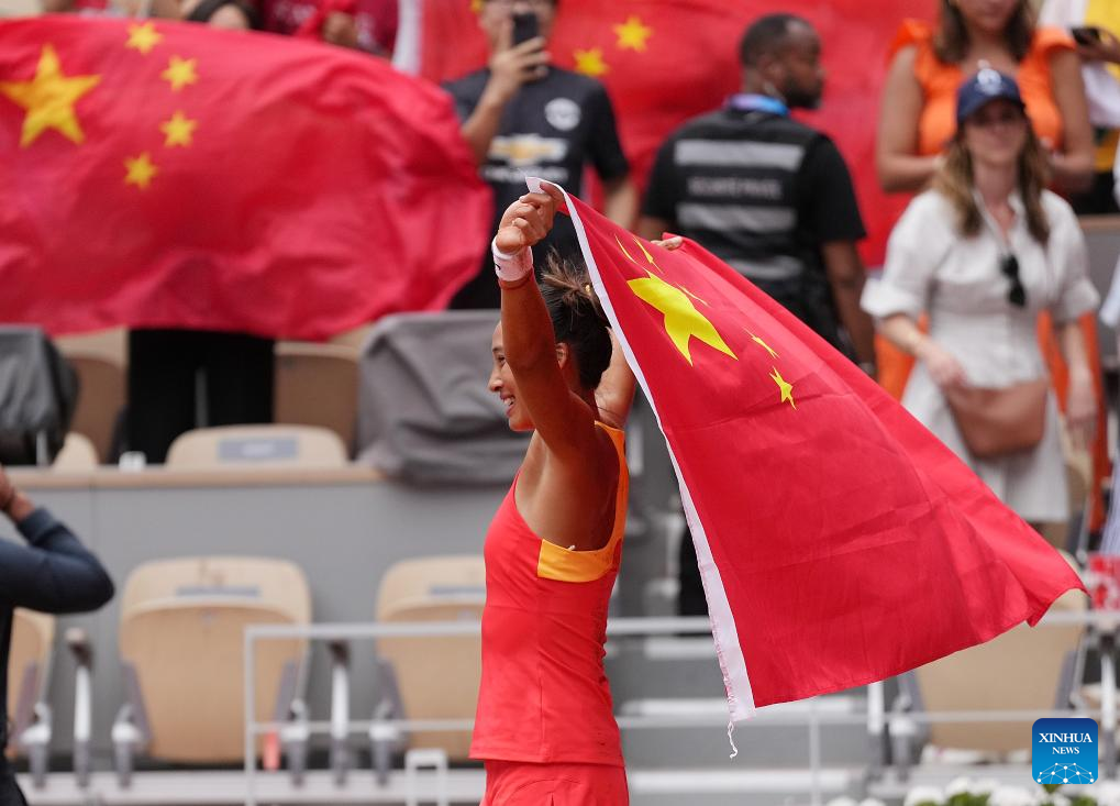 Zheng Qinwen of China celebrates after the women's singles gold medal match of tennis against Donna Vekic of Croatia at the Paris 2024 Olympic Games in Paris, France, on Aug. 3, 2024. (Xinhua/Wan Xiang)