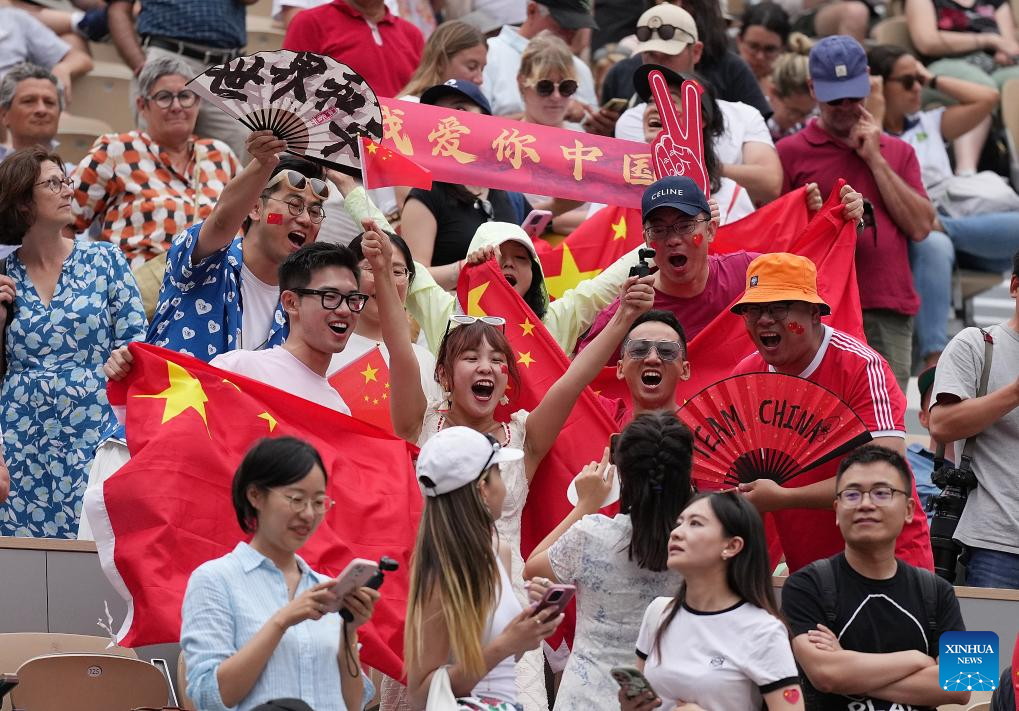 Spectators cheer for Zheng Qinwen of China during the women's singles gold medal match of tennis at the Paris 2024 Olympic Games in Paris, France, on Aug. 3, 2024. (Xinhua/Wan Xiang)
