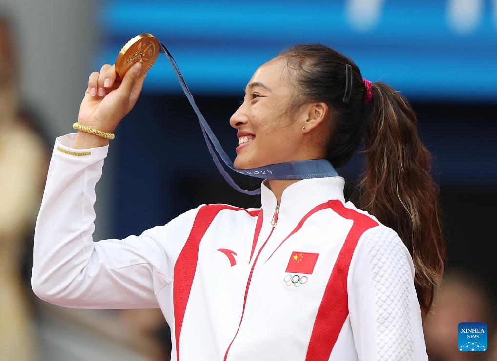 Gold medalist Zheng Qinwen of China shows the medal during the victory ceremony for the women's singles of tennis at the Paris 2024 Olympic Games in Paris, France, on Aug. 3, 2024. (Xinhua/Lai Xiangdong)