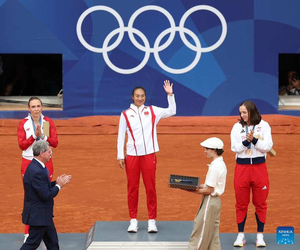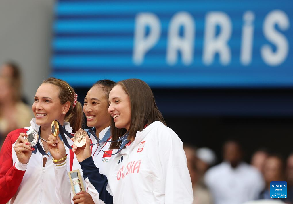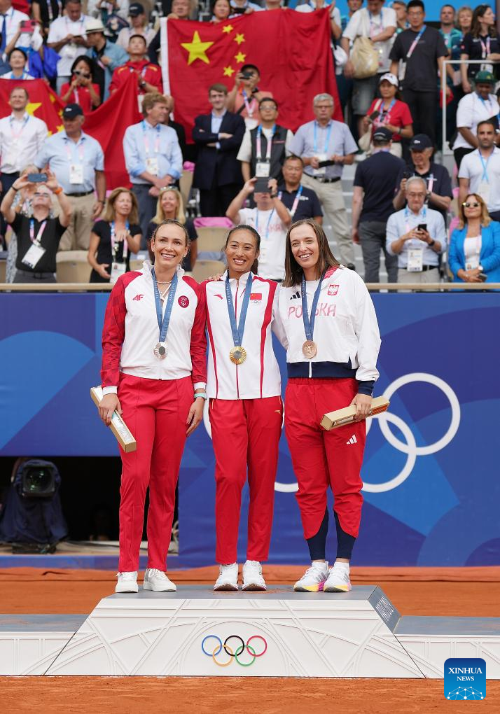 Gold medalist Zheng Qinwen (C) of China, silver medalist Donna Vekic (L) of Croatia and bronze medalist Iga Swiatek of Poland attend the victory ceremony for the women's singles of tennis at the Paris 2024 Olympic Games in Paris, France, on Aug. 3, 2024. (Xinhua/Lai Xiangdong)