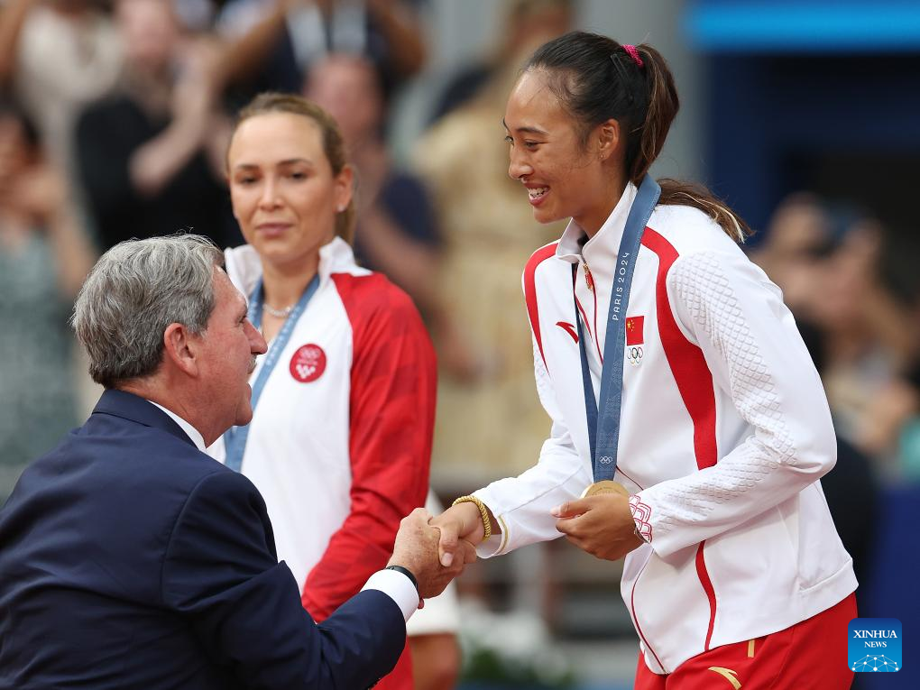 Gold medalist Zheng Qinwen (R) of China attends the victory ceremony for the women's singles of tennis at the Paris 2024 Olympic Games in Paris, France, on Aug. 3, 2024. (Xinhua/Wan Xiang)