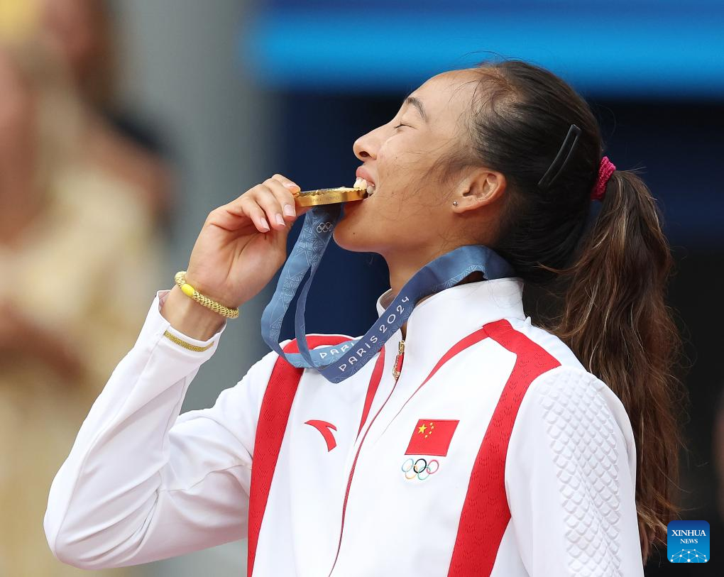 Gold medalist Zheng Qinwen of China bites the medal during the victory ceremony for the women's singles of tennis at the Paris 2024 Olympic Games in Paris, France, on Aug. 3, 2024. (Xinhua/Gao Jing)
