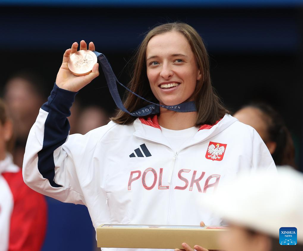 Bronze medalist Iga Swiatek of Poland shows the medal during the victory ceremony for the women's singles of tennis at the Paris 2024 Olympic Games in Paris, France, on Aug. 3, 2024. (Xinhua/Gao Jing)