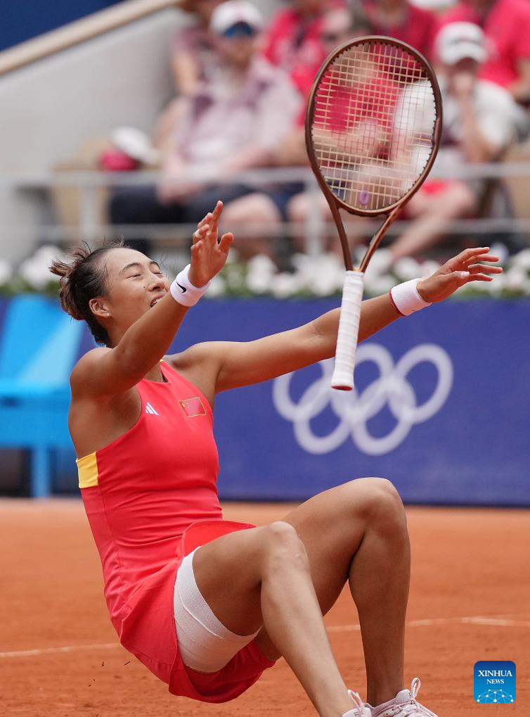 Zheng Qinwen of China competes during the women's singles gold medal match of tennis against Donna Vekic of Croatia at the Paris 2024 Olympic Games in Paris, France, on Aug. 3, 2024. (Xinhua/Wan Xiang)