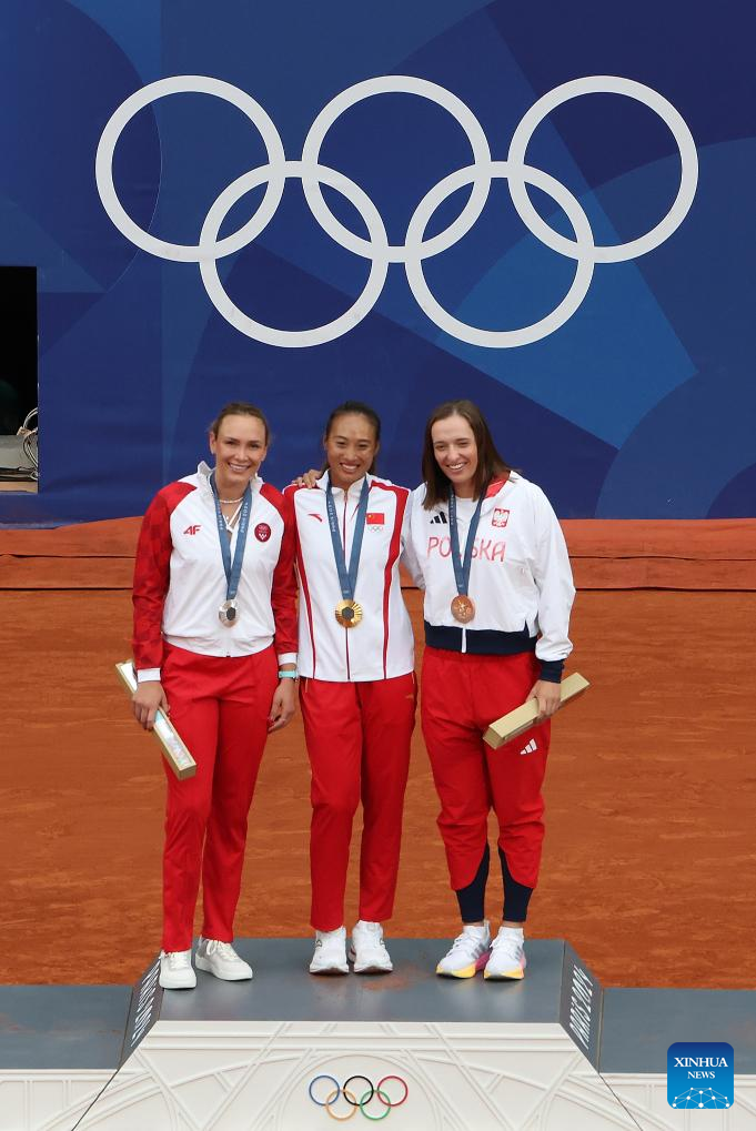 Gold medalist Zheng Qinwen (C) of China, silver medalist Donna Vekic (L) of Croatia and bronze medalist Iga Swiatek of Poland pose during the victory ceremony for the women's singles of tennis at the Paris 2024 Olympic Games in Paris, France, on Aug. 3, 2024. (Xinhua/Gao Jing)