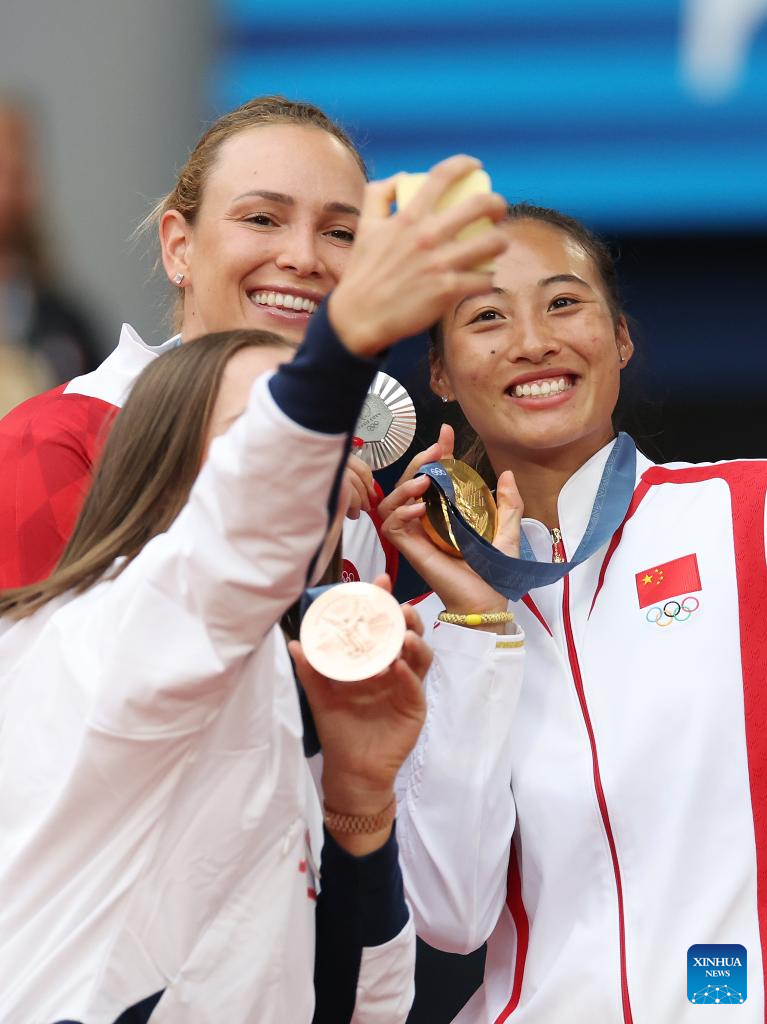 Gold medalist Zheng Qinwen (L) of China shows the medal during the victory ceremony for the women's singles of tennis at the Paris 2024 Olympic Games in Paris, France, on Aug. 3, 2024. (Xinhua/Gao Jing)