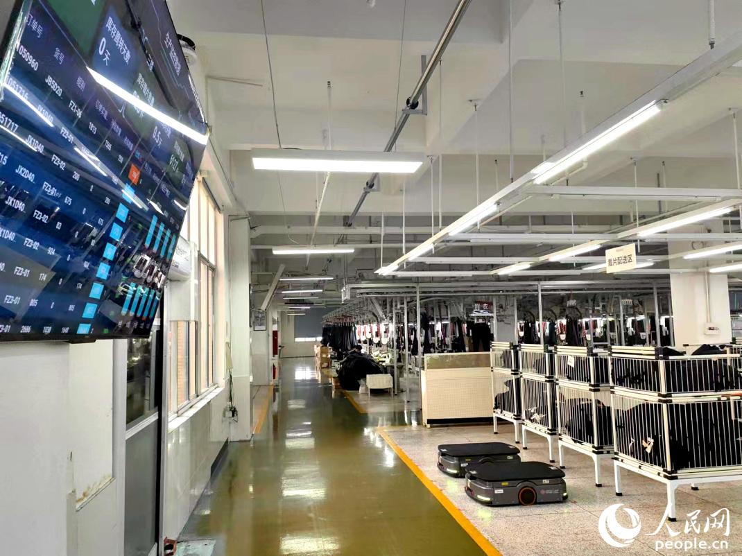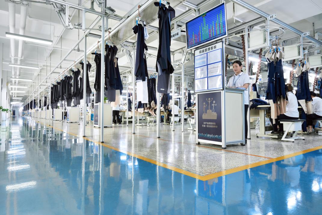 At the other end of the workshop, batches of pants are continuously transported through an intelligent hanging system to various different work groups.