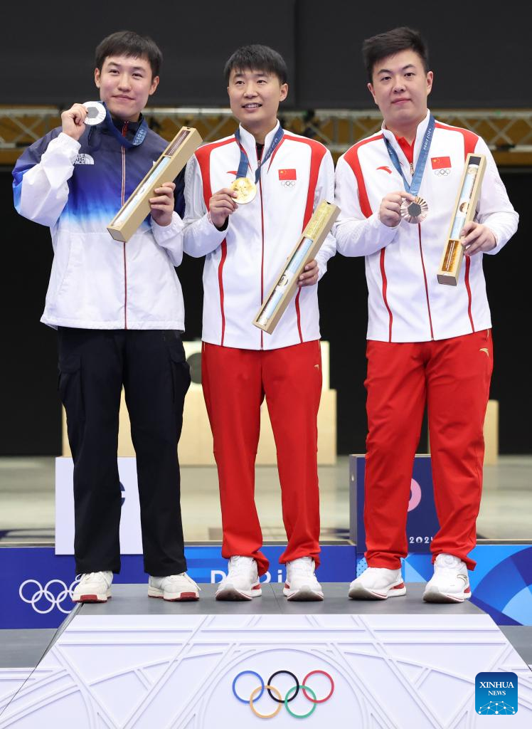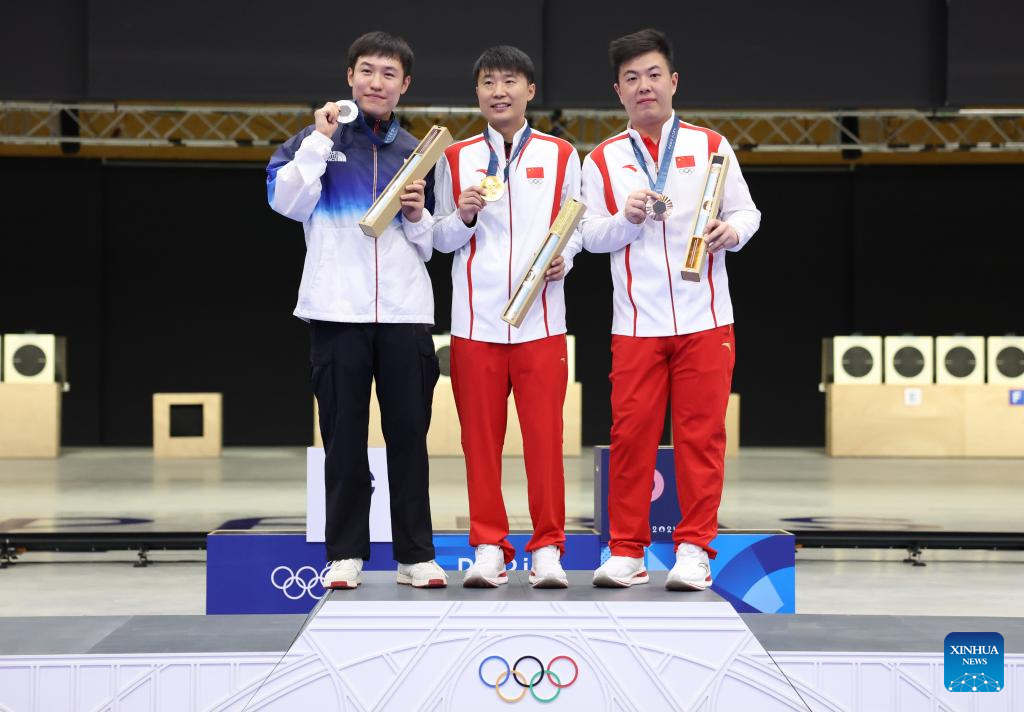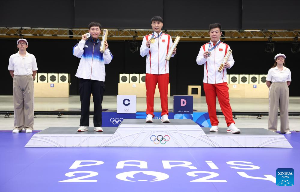 Gold medalist Li Yuehong (C) of China, silver medalist Cho Yeongjae (L) of South Korea and bronze medalist Wang Xinjie of China attend the awarding ceremony after the 25m rapid fire pistol men's final of shooting at the Paris 2024 Olympic Games in Chateauroux, France, Aug. 5, 2024. (Xinhua/Zhao Dingzhe)