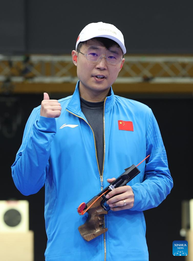 Li Yuehong of China celebrates after the 25m rapid fire pistol men's final of shooting at the Paris 2024 Olympic Games in Chateauroux, France, Aug. 5, 2024. (Xinhua/Zhang Fan)