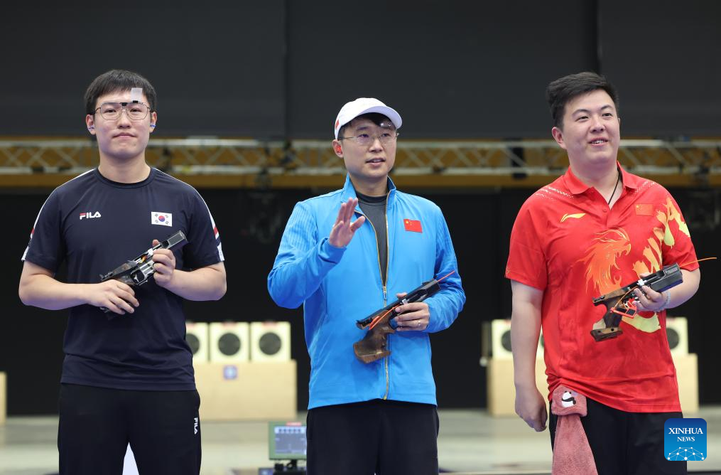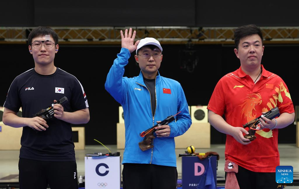 Li Yuehong (C) of China, Cho Yeongjae (L) of South Korea and Wang Xinjie of China are seen after the 25m rapid fire pistol men's final of shooting at the Paris 2024 Olympic Games in Chateauroux, France, Aug. 5, 2024. (Xinhua/Zhang Fan)