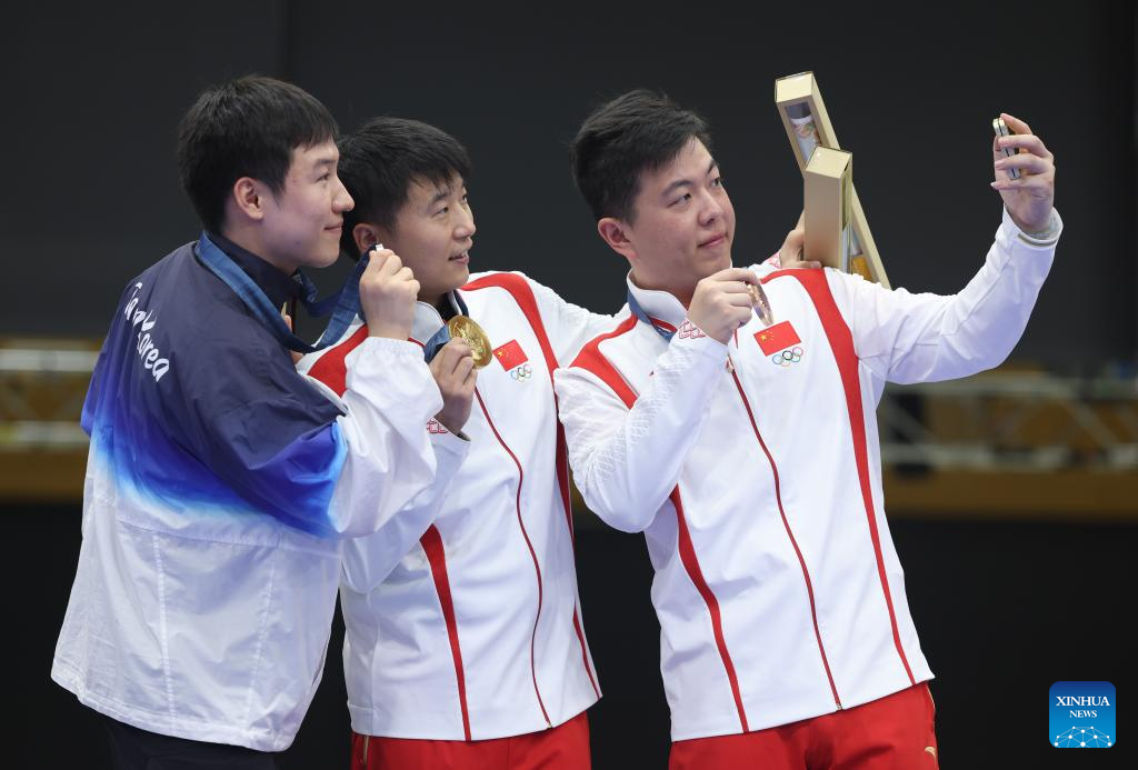 Gold medalist Li Yuehong (C) of China, silver medalist Cho Yeongjae (L) of South Korea and bronze medalist Wang Xinjie of China take selfies during the awarding ceremony after the 25m rapid fire pistol men's final of shooting at the Paris 2024 Olympic Games in Chateauroux, France, Aug. 5, 2024. (Xinhua/Zhao Dingzhe)
