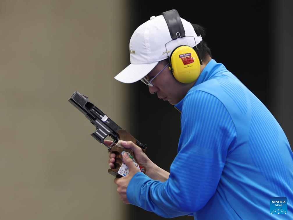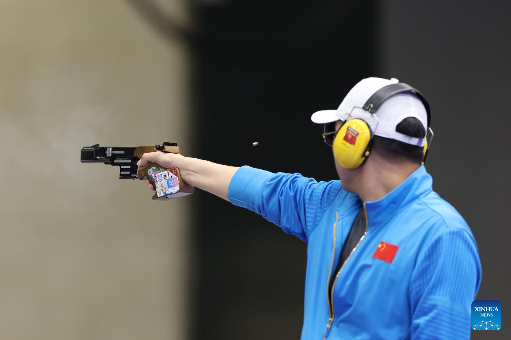Li Yuehong of China competes during the 25m rapid fire pistol men's final of shooting at the Paris 2024 Olympic Games in Chateauroux, France, Aug. 5, 2024. (Xinhua/Zhang Fan)