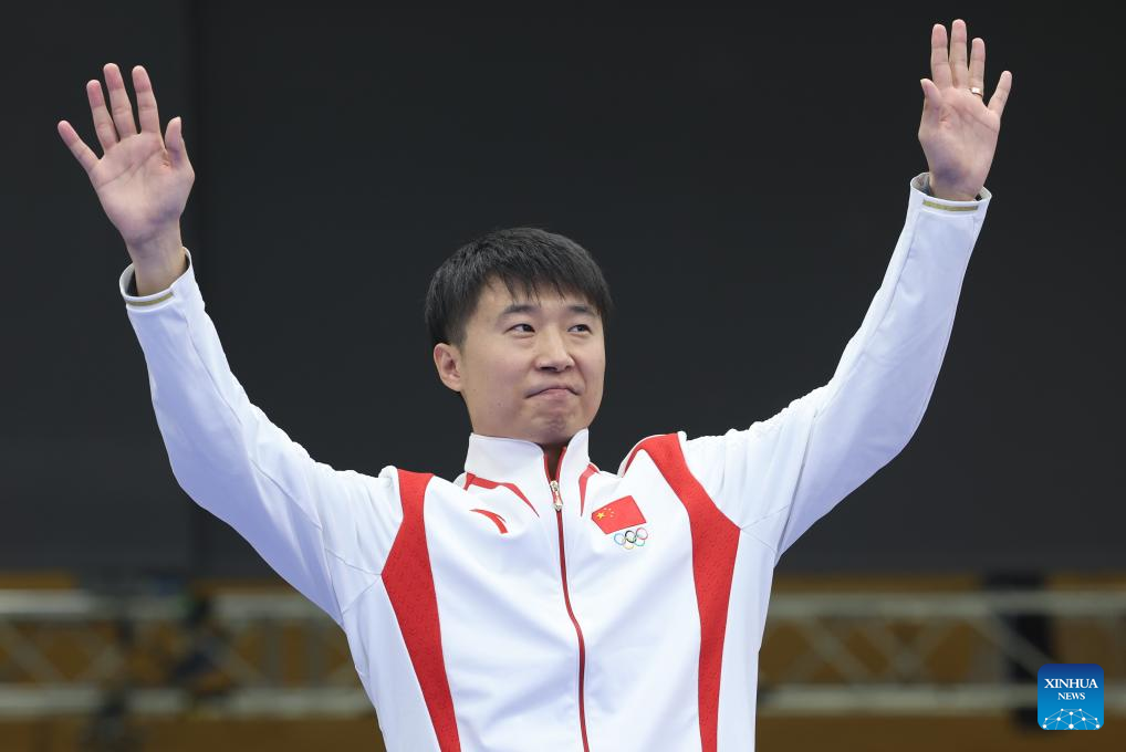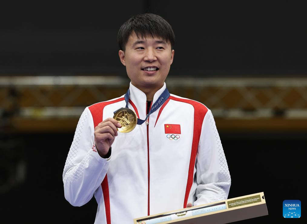 Gold medalist Li Yuehong of China attends the awarding ceremony after the 25m rapid fire pistol men's final of shooting at the Paris 2024 Olympic Games in Chateauroux, France, Aug. 5, 2024. (Xinhua/Zhao Dingzhe)