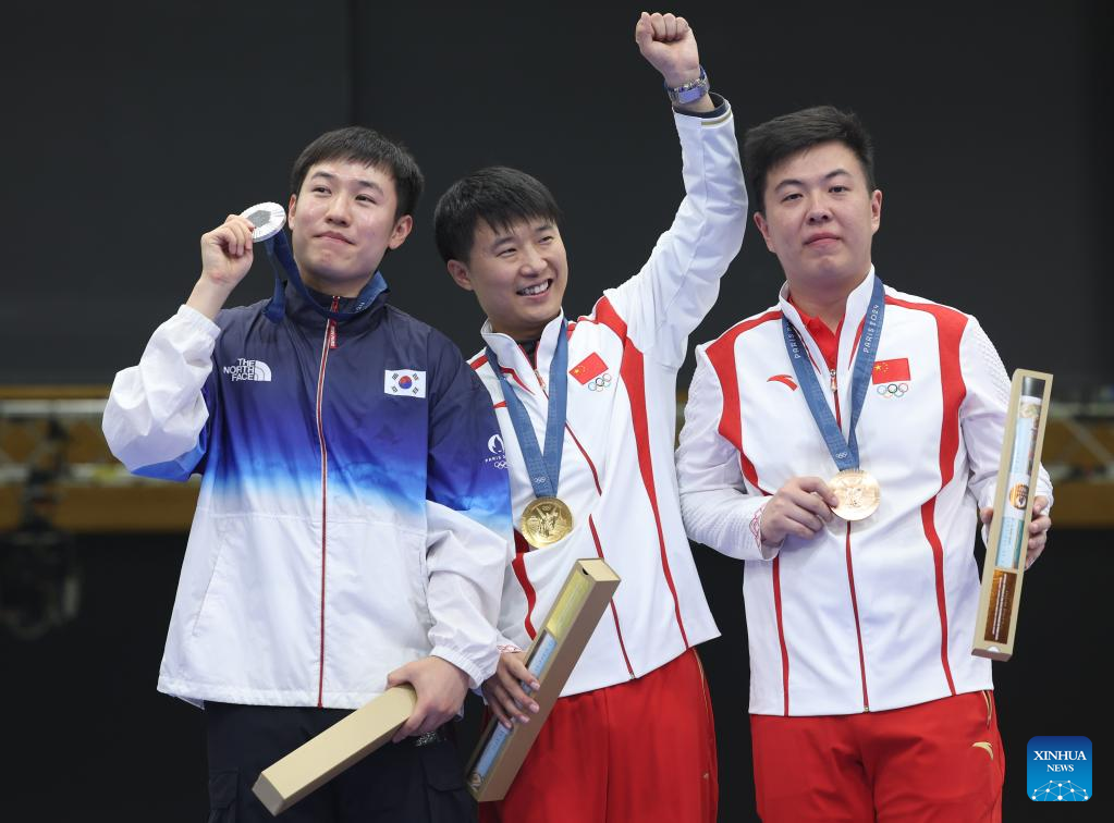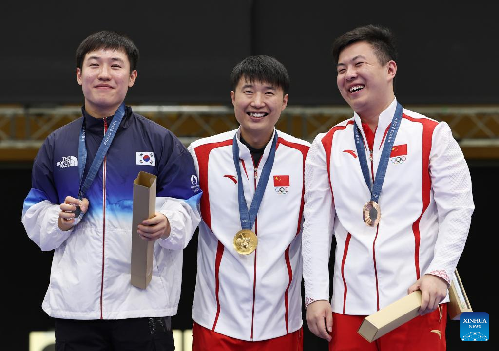 Gold medalist Li Yuehong (C) of China, silver medalist Cho Yeongjae (L) of South Korea and bronze medalist Wang Xinjie of China attend the awarding ceremony after the 25m rapid fire pistol men's final of shooting at the Paris 2024 Olympic Games in Chateauroux, France, Aug. 5, 2024. (Xinhua/Zhang Fan)