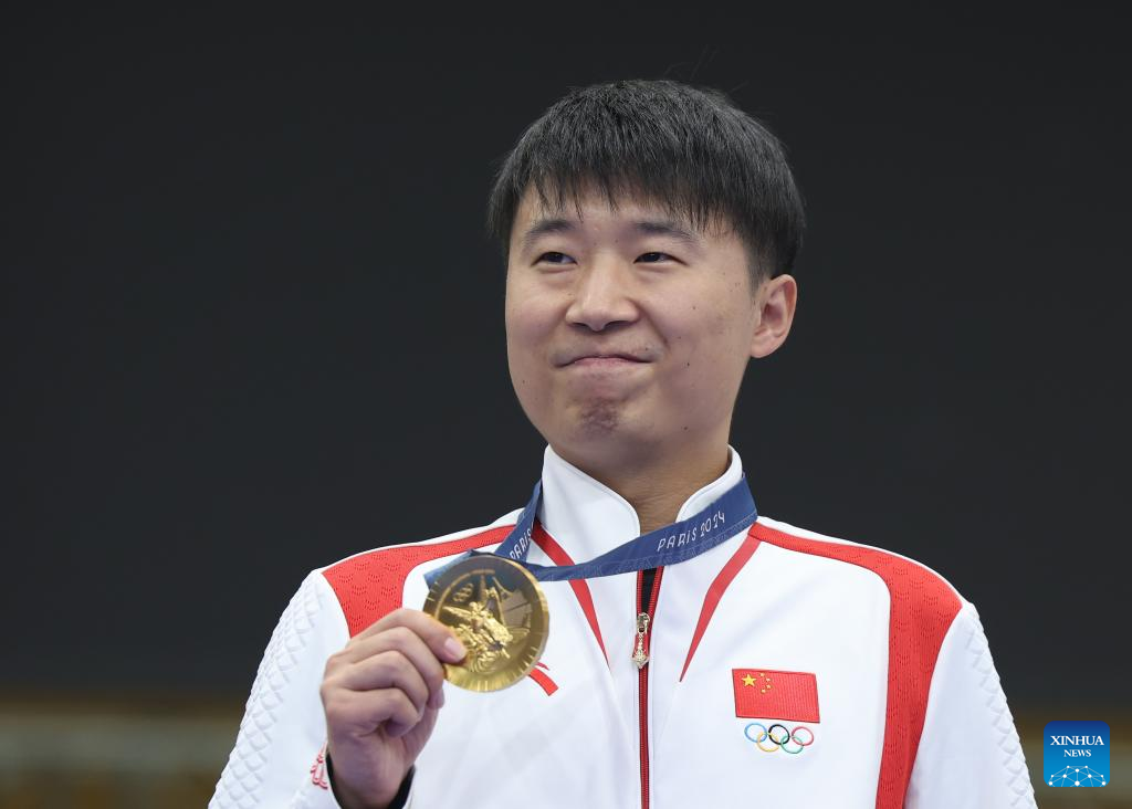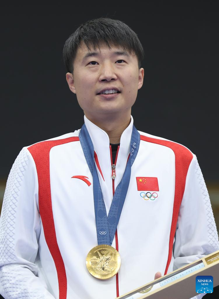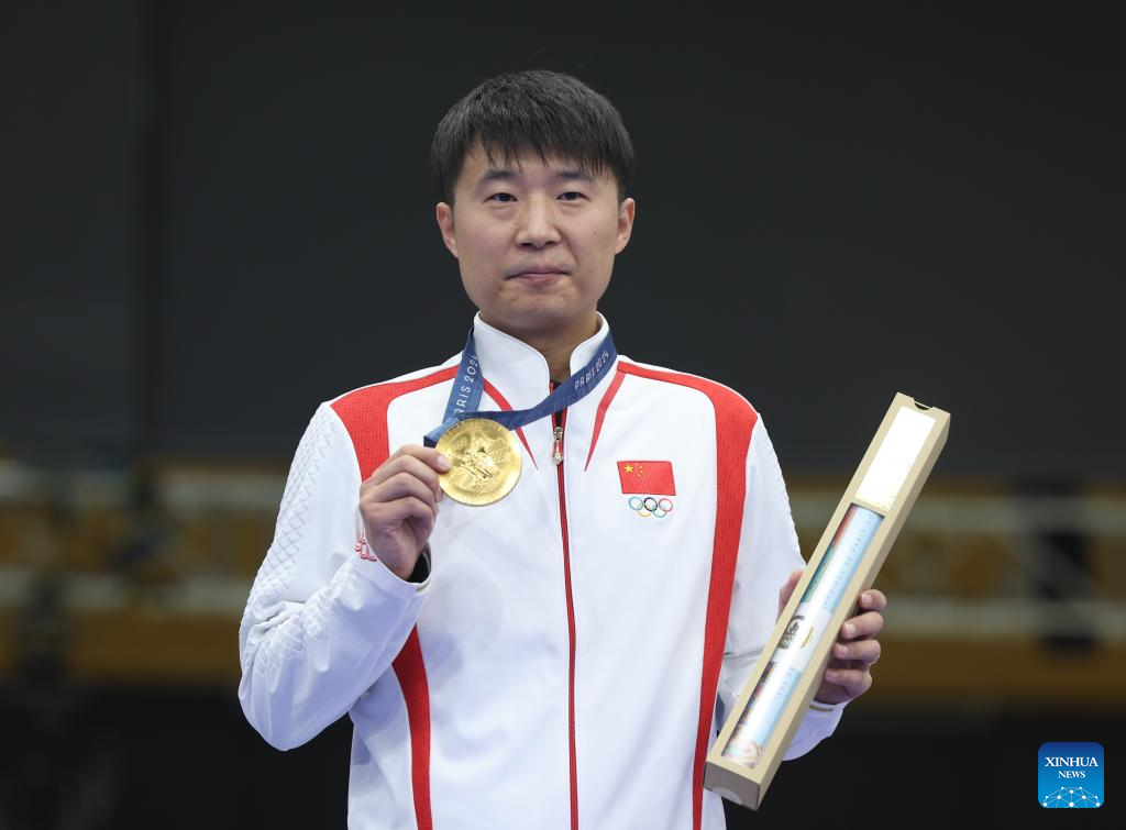 Gold medalist Li Yuehong of China attends the awarding ceremony after the 25m rapid fire pistol men's final of shooting at the Paris 2024 Olympic Games in Chateauroux, France, Aug. 5, 2024. (Xinhua/Zhang Fan)