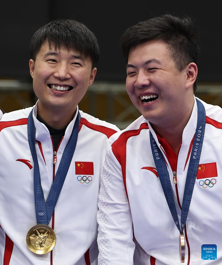 Gold medalist Li Yuehong (L) of China and bronze medalist Wang Xinjie of China are seen during the awarding ceremony after the 25m rapid fire pistol men's final of shooting at the Paris 2024 Olympic Games in Chateauroux, France, Aug. 5, 2024. (Xinhua/Zhang Fan)
