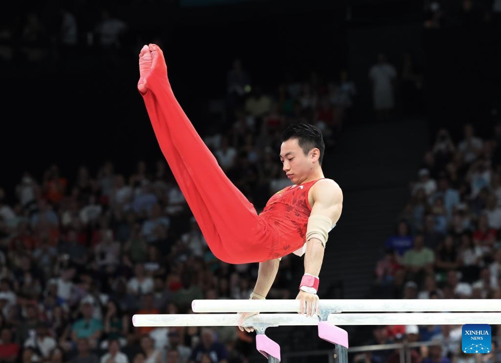 Zou Jingyuan of China competes during the men's parallel bars final of artistic gymnastics at the Paris 2024 Olympic Games in Paris, France, Aug. 5, 2024. (Xinhua/Lai Xiangdong)