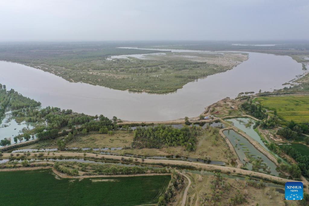 This aerial drone photo taken on Aug. 1, 2024 shows the Tarim River flood water diverted to irrigate a forest of populus euphratica in Xayar County, northwest China's Xinjiang Uygur Autonomous Region. (Photo by Qiang Limin/Xinhua)