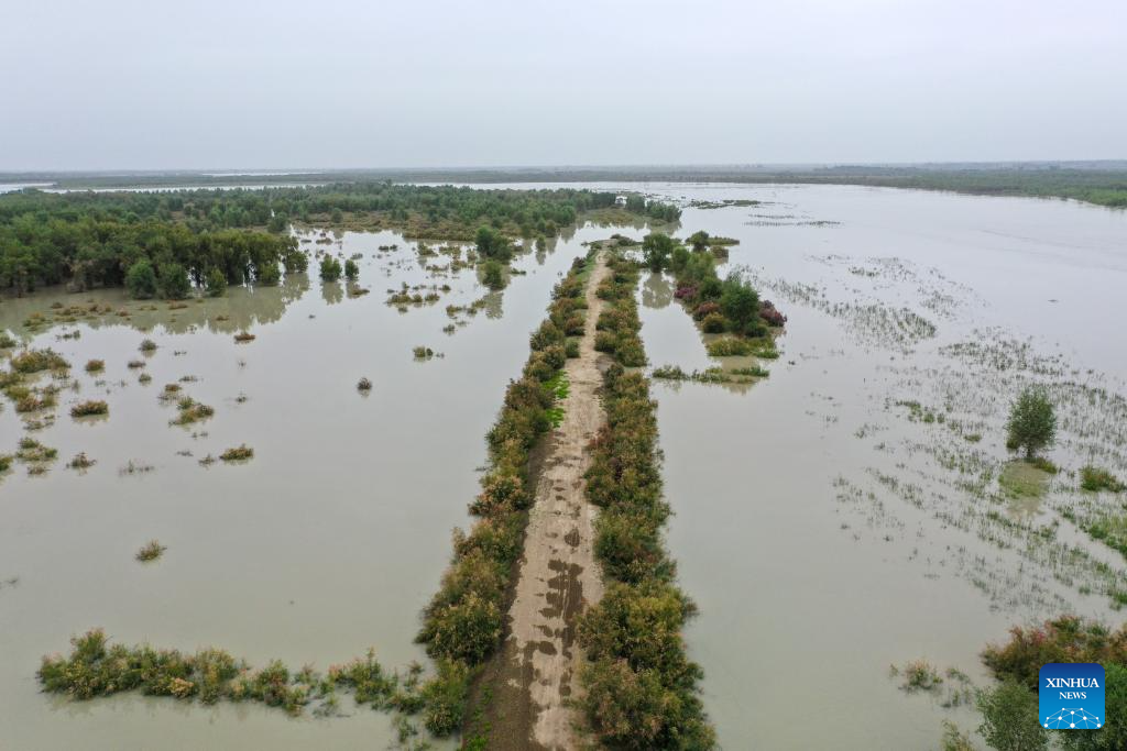 This photo taken on Aug. 3, 2024 shows the Tarim River flood water diverted to irrigate a forest of populus euphratica in Xayar County, northwest China's Xinjiang Uygur Autonomous Region. (Xinhua/Ding Lei)