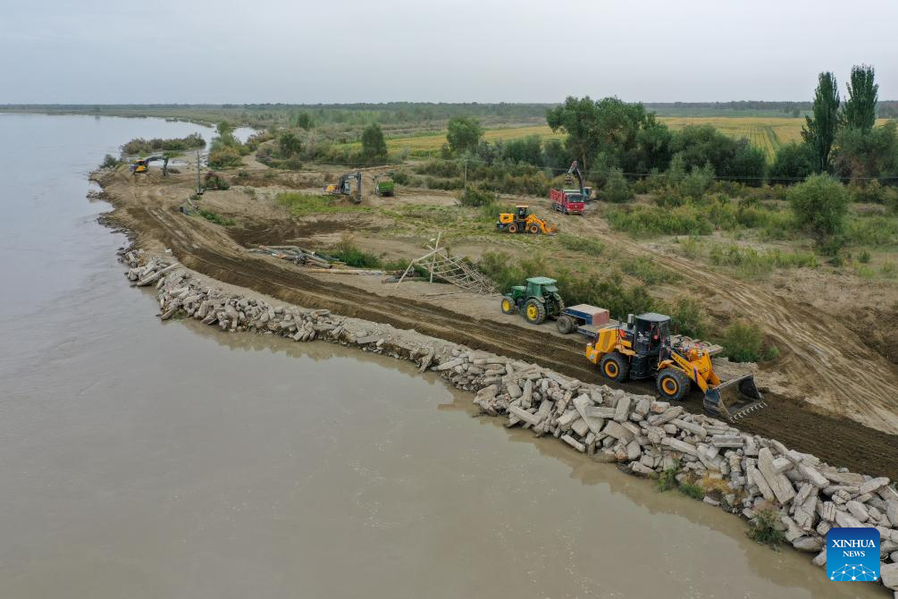 Emergency workers reinforce a dike in Xayar County, northwest China's Xinjiang Uygur Autonomous Region, Aug. 3, 2024. (Xinhua/Ding Lei)
